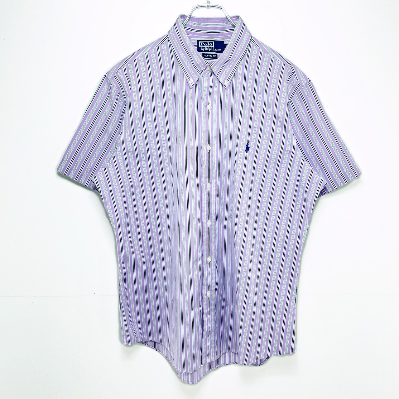 【US古着・00’s~】POLO RALPH LAUREN ポロラルフローレン CUSTOM FIT 半袖ストライプシャツ メンズ サイズ表記16 40/41 XL~2XL相当 パープル×ホワイト×ブラック