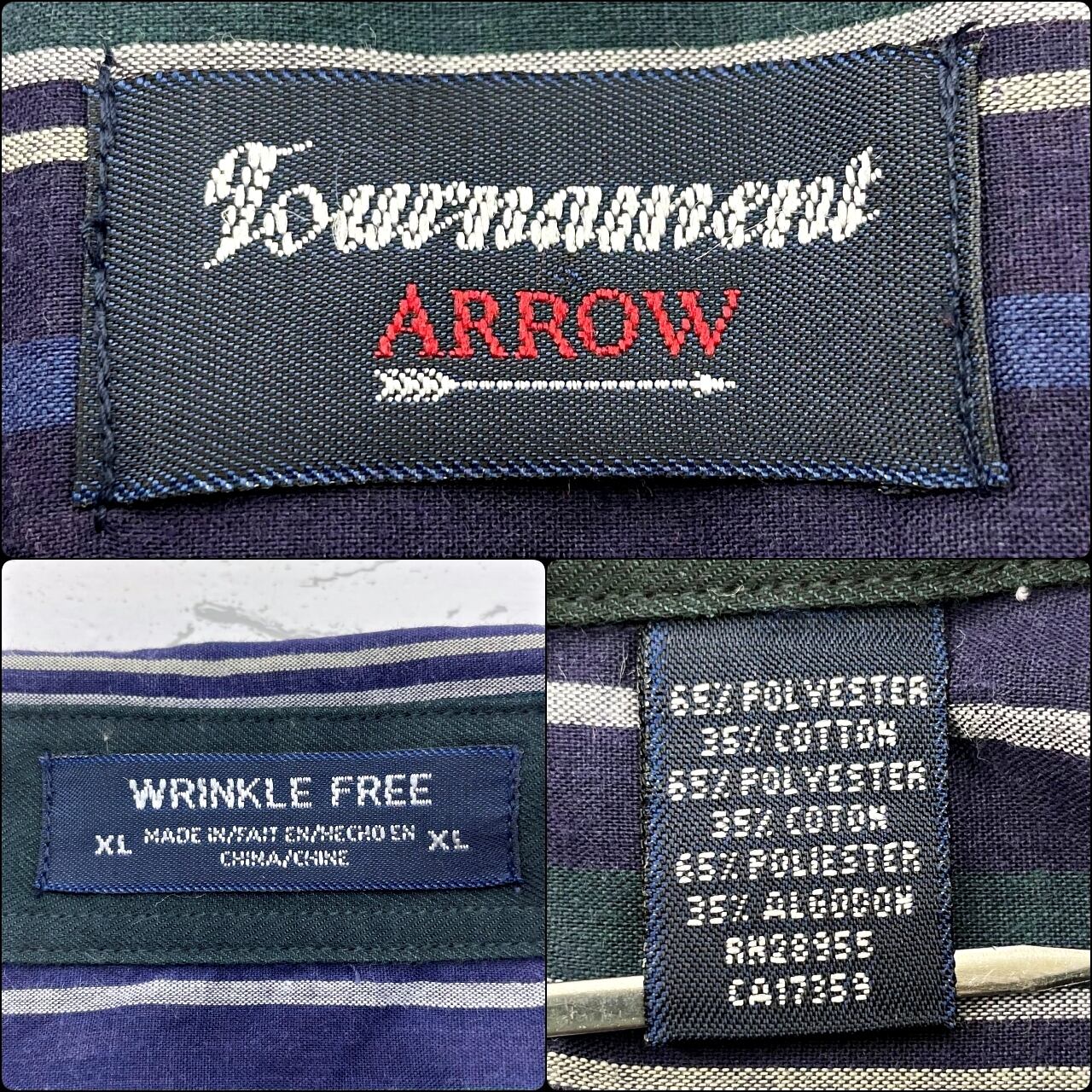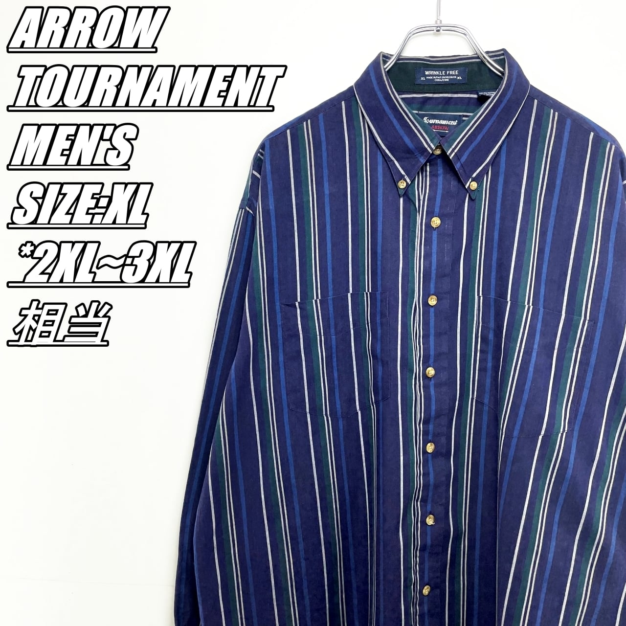 【90~00’s】ARROW TOURNAMENT アロートーナメント ストライプ柄長袖シャツ メンズ サイズ表記XL 2XL~3XL相当 ネイビー系×グリーン×グレー