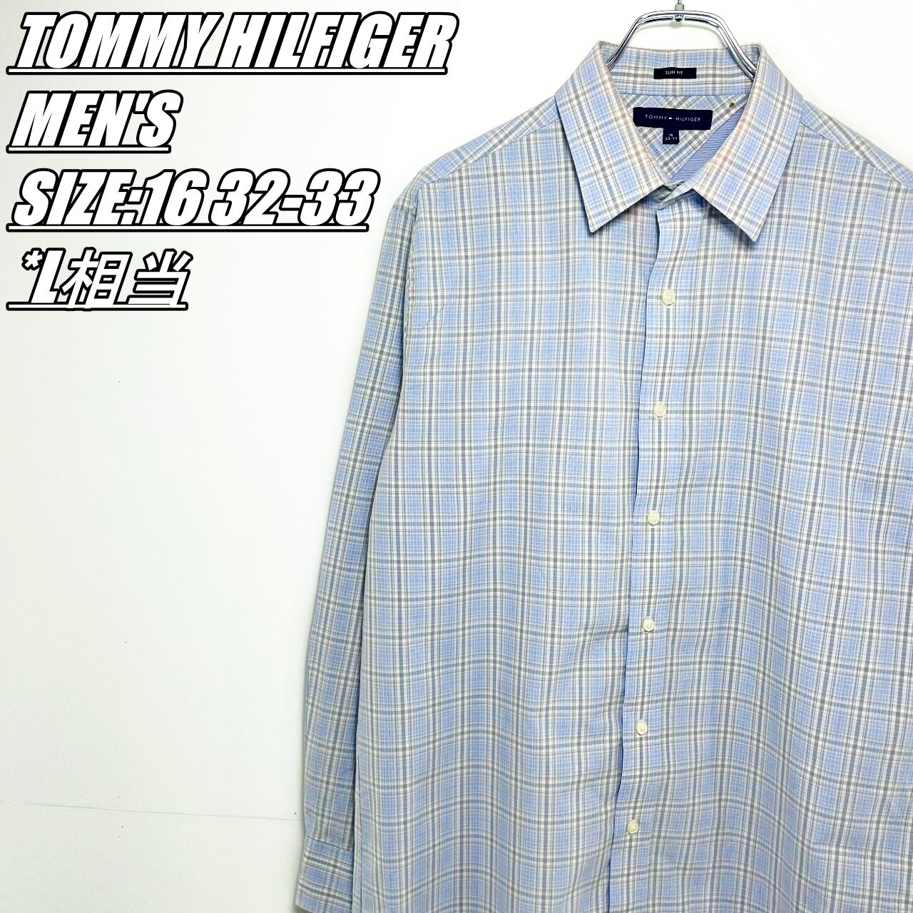 TOMMY HILFIGER トミーヒルフィガー チェック柄長袖シャツ SLIM FIT メンズ サイズ表記16 32-33 L相当 ライトブルー×ベージュ系×グレー系